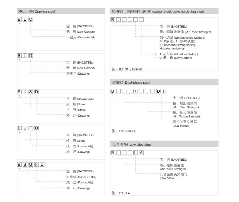 寶鋼產(chǎn)品的牌號(hào)一部分直接使用國(guó)外標(biāo)準(zhǔn)的牌號(hào),一部分采用自己的命名方式命名?,F(xiàn)簡(jiǎn)要介紹寶鋼自己命名的牌號(hào)的方法。