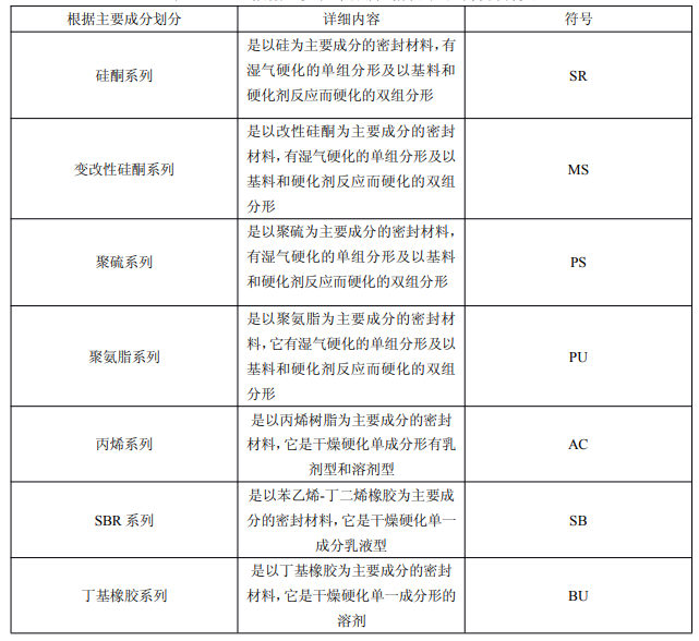 根據主要化學成分劃分的密封材料種類